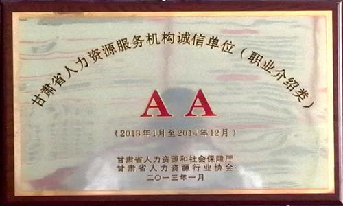2013年2月公司職介所被甘肅省人力資源和社會(huì)保障局、甘肅省人力資源行業(yè)協(xié)會(huì)授予“AA級(jí)誠信單位”;